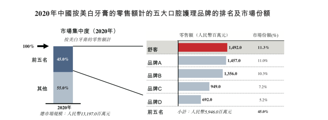 根据弗若斯特沙利文的资料,以2020年全部口腔护理产品的零售额计算,薇美姿以5.3%的市场份额在中国口腔护理市场中排名第四。