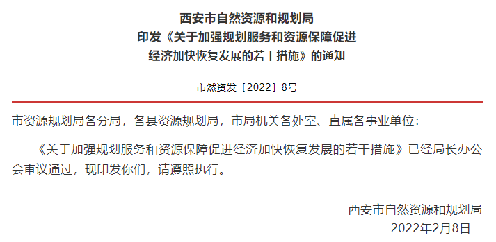 2月8日,西安市自然资源和规划局印发《关于加强规划服务和资源保障促进经济加快恢复发展的若干措施》的通知,提出如下措施。