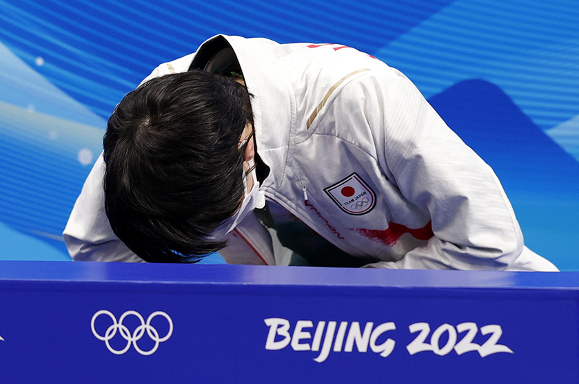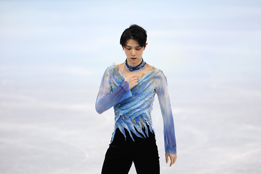 北京时间2022年2月10日午间,花样滑冰男子单人滑自由滑比赛已过半,日本运动员羽生结弦身穿青白色底色缀金色亮片刺绣上衣亮相。