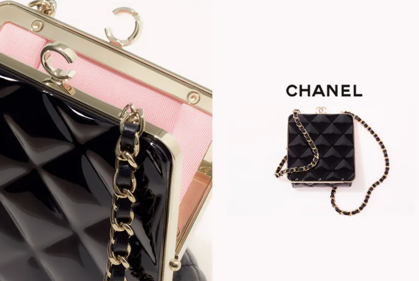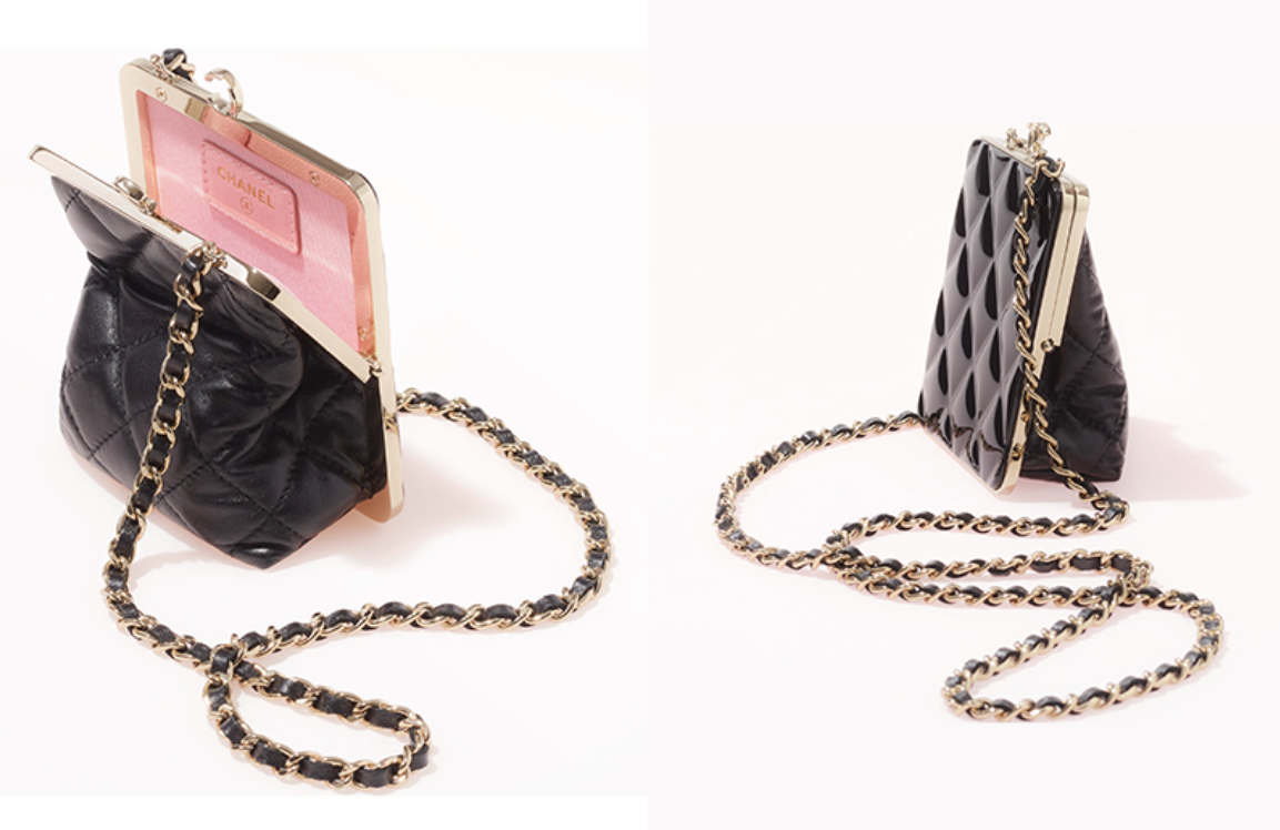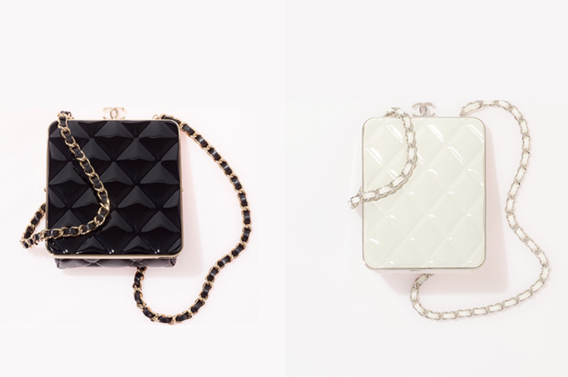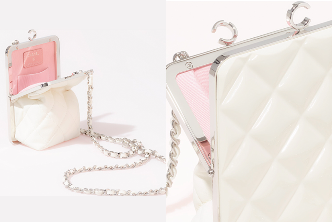 “Clutch with Chain” 以可可爱爱的方形造型亮相,共黑白两色。外部由光滑的小羊皮制作,内衬配以柔和的粉红色,品牌经典的绗缝菱格纹与闪亮的金属链条融合,为手袋注入华丽唯美的气质。