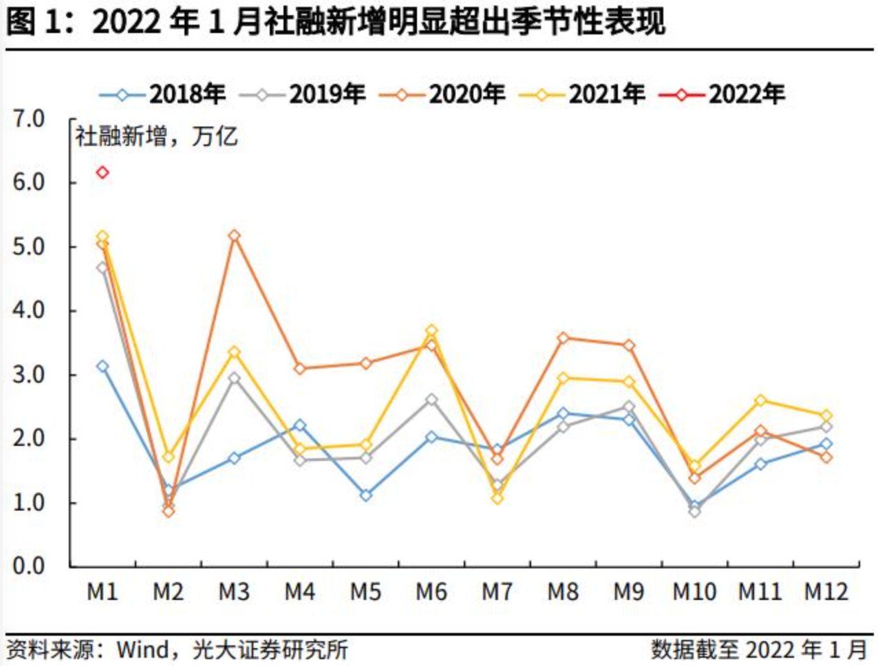 2022年2月10日,中国人民银行公布1月货币金融数据。社融新增6.17万亿元,同比多增9842亿元,前值2.37万亿元,存量同比增速10.5%,前值10.3%;人民币贷款新增3.98万亿元,同比多增0.39万亿元,前值1.13万亿元;M2同比增速9.8%,前值9.0%。