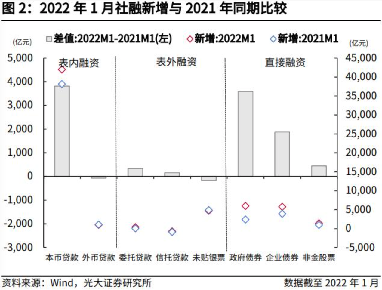 结构上来看,与2021年同期相比,1月表内融资多增3751亿元,表外融资多增328亿元,直接融资多增5919亿元。其中,社融口径下的新增人民币贷款同比多增3818亿元,政府债券净融资同比多增3589亿元,企业债券净融资同比多增1882亿元,是1月新增社融超预期的主要拉动项。