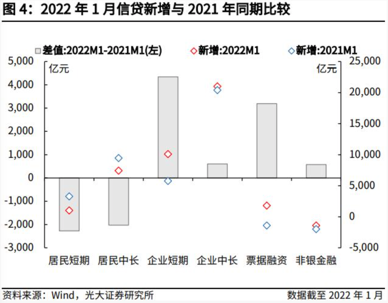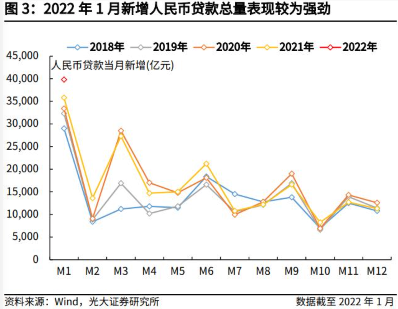 总量上来看,新增信贷相较往年同期表现较为强劲。1月新增信贷3.98万亿元,与2021年同期相比多增0.39万亿元,与2020年同期相比多增0.64万亿元。