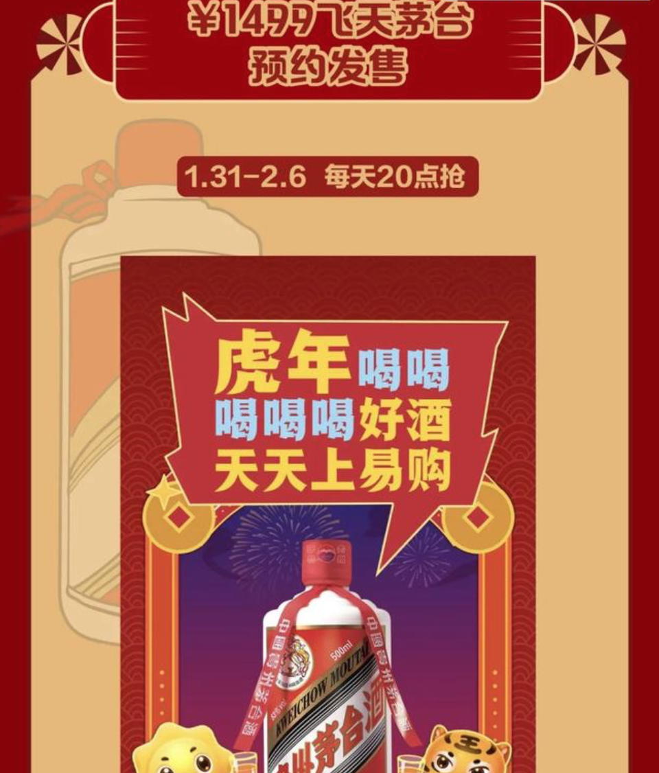 不仅如此,根据茅台时空相关报道显示,苏宁易购也提高每天飞天茅台酒发售量,每天20点抢购茅台酒,活动持续至2月6日春节假期结束。对此,苏宁易购超市负责人表示,这次的放量活动,无任何门槛,所有消费者只需提前预约即可。