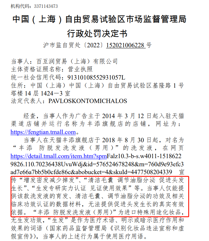 行政处罚决定书显示,具体处罚事由为百互润在其天猫丰添旗舰店对“丰添 防脱发洗发液(男用)宣传“增发密发减少掉发”“清洁毛囊、调节油脂分泌、促进头发生长”“生发专研实力认证、见证使用效果”等。百互润仅能提供该款洗发液的育发、清洁毛囊、调节油脂分泌的功效及相关临床功效认证的数据材料,无法提供促进头发生长的真实有效依据。