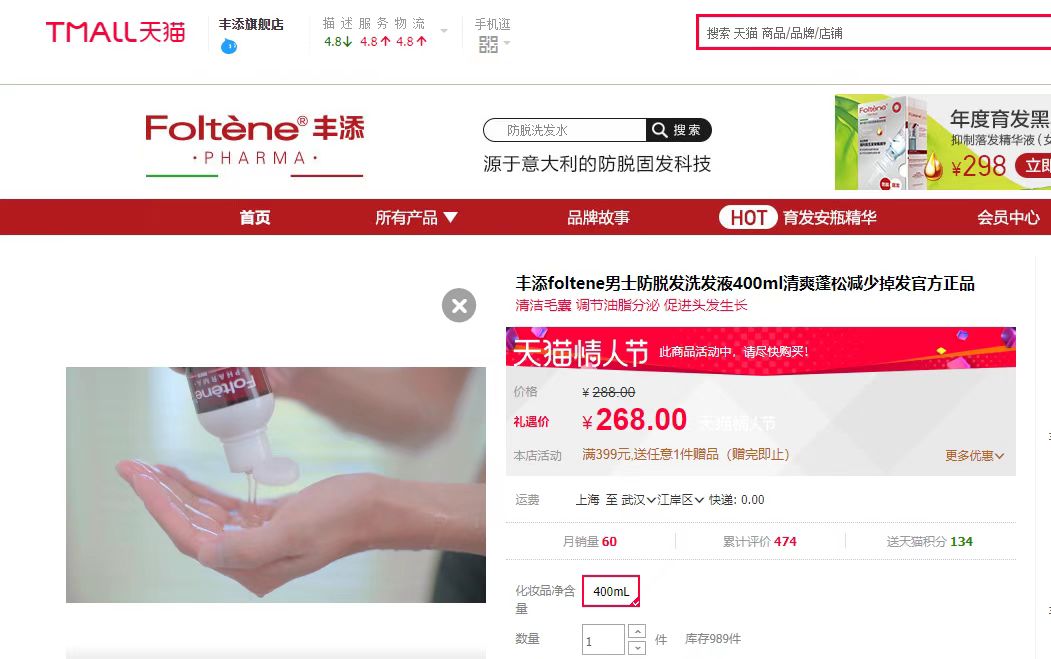 在丰添天猫旗舰店,今日青眼注意到,该款男士防脱洗发液仍宣传“促进头发生长”。