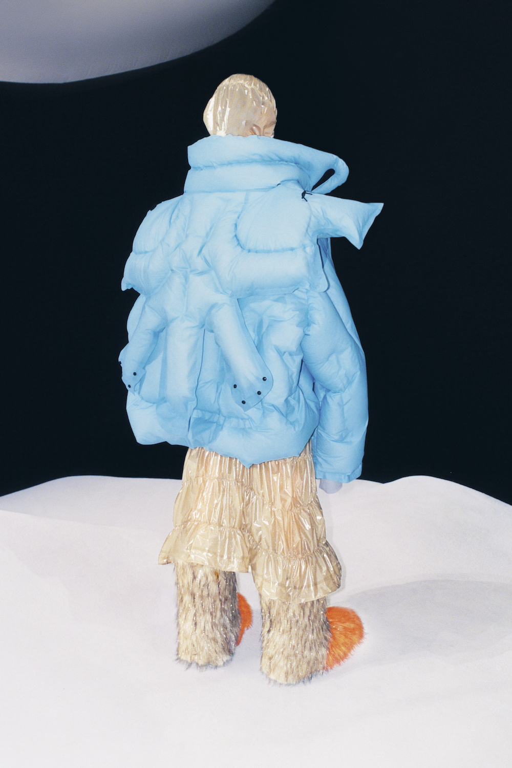 联名系列旨在重塑服装与穿着者之间的关系,以膨胀衣身漂浮于身体周围,打造如雕塑般的时尚服装。本系列设计灵感并非源于盟可睐Moncler的经典雪山环境,而是来自深不见底的水下世界。该系列着重探索极端环境下人与自然和谐相处的可能。设计灵感来源于冰钓帐篷、充气水池、充气背心在水上环境的悬浮方式,以及水下雕塑在与珊瑚等海洋生物融合共生后,产生的沧桑变化。