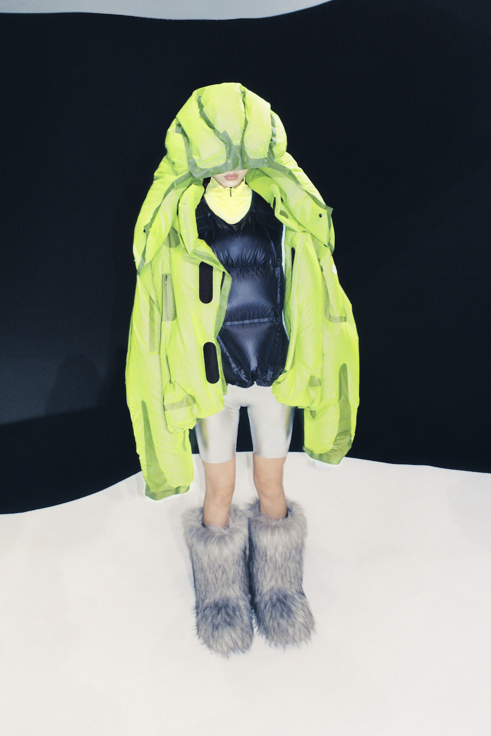 可调节的中式结扣、隐形拉链、带拇指孔的针织袖口等细节平添功能特性,并以质地轻盈的面料匠心造就超大廓形。全新系列包括大衣、填充背心和连帽或非连帽短夹克,以质地轻盈的亮面褶皱尼龙精制而成,并搭配上夸张的填充面罩、骑行短裤和紧身裤。巧妙糅合棕色、浅绿色、浅灰色、沙色、蓝色和大地色系,生动再现深海雕塑上珊瑚和真菌的自然生长形态。诸多层面的细致考量与潜心斟酌,最终造就一个令人耳目一新的全新系列。