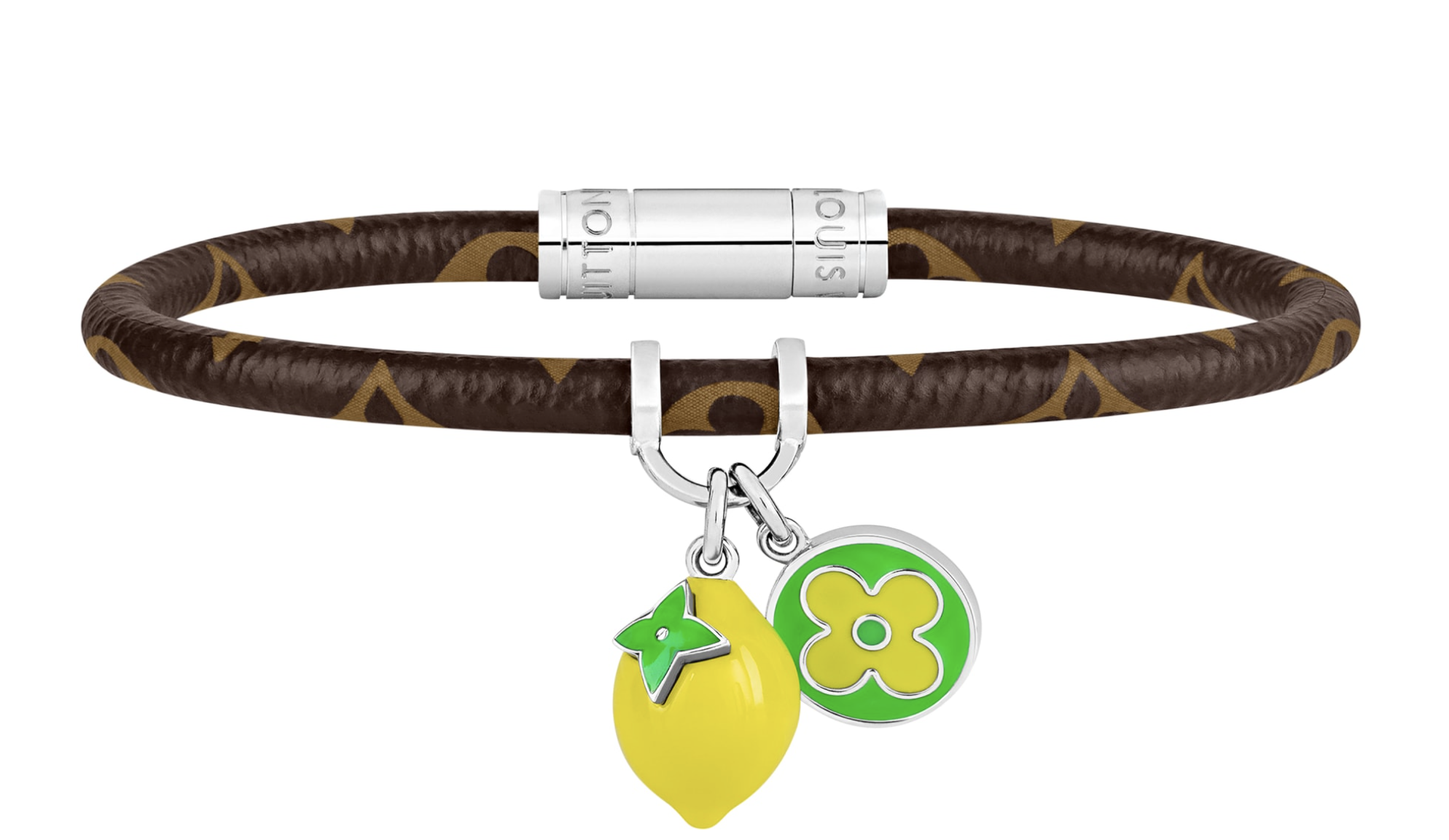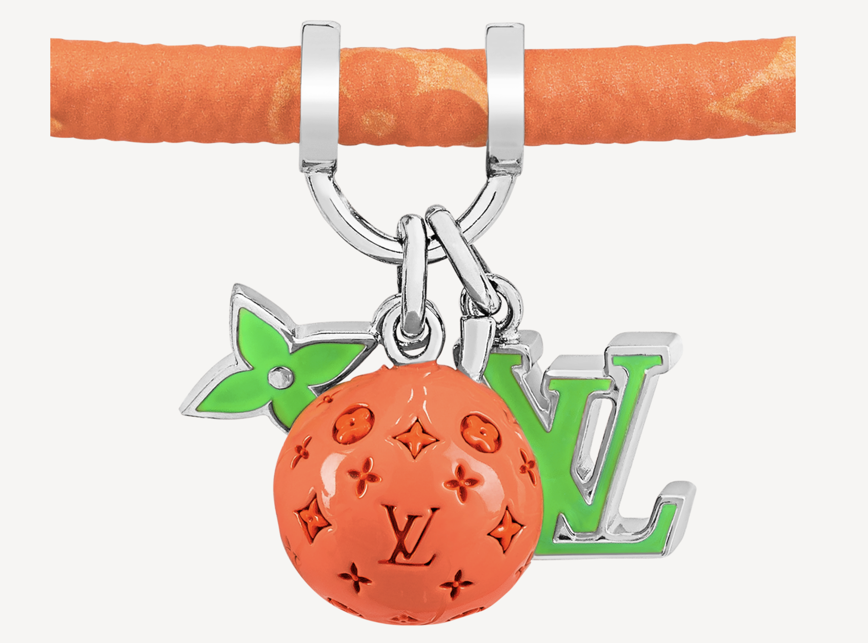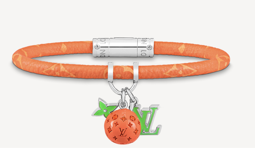 Hang It LV Fruits皮革手镯缀有明丽夺目的吊饰,配上今季的色调,彰显2022春夏系列清新的全新主题。标志性的图案及Monogram帆布绳让品牌爱好者散发迷人魅力,而这款夏日风格的配饰同时可配衬男士时尚珠宝系列配衬的项链及戒指。