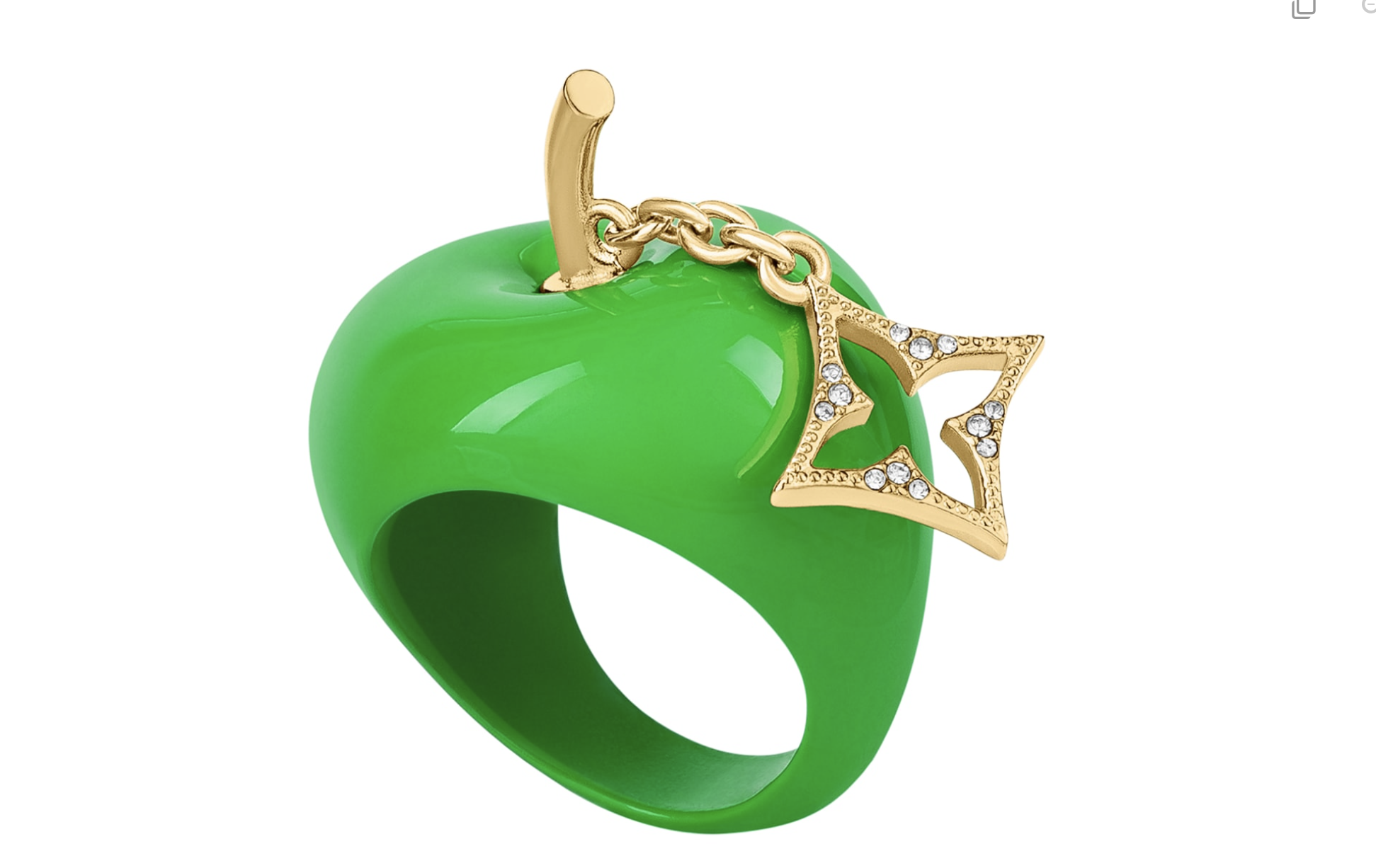 系列戒指呈现苹果造型,苹果茎以鲜色珐琅饰面配搭抛光打磨金属设计,系挂亮面的手工水晶莱恩石打造的Monogram花卉图案吊饰,呼应今季的全新水果主题,可完美配衬皮具精品系列众多款式。