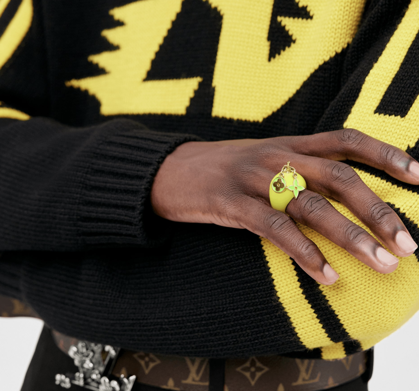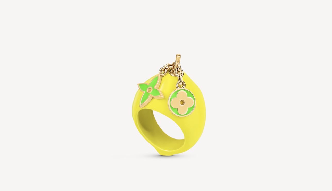 柠檬戒指可完美配衬今季趣致水果主题的众多配饰,柠檬造型配合手工镶嵌水晶莱恩石,细节设计包含系挂Monogram花卉图案吊饰,设计时尚前卫,洋溢青春活力。