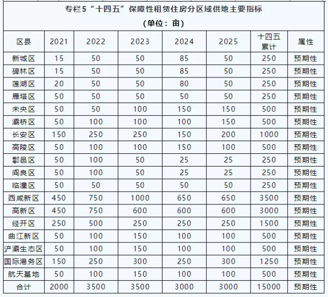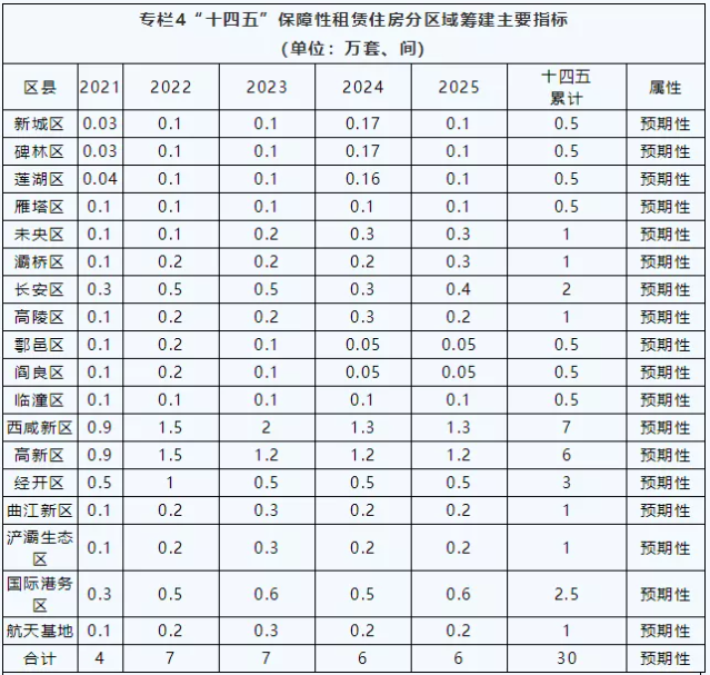 2022年2月11日,西安住建发布《西安市“十四五”保障性租赁住房发展规划》(以下简称《规划》)表明,“十四五”期间,西安市保障性租赁住房总需求约30.4万套(间)。