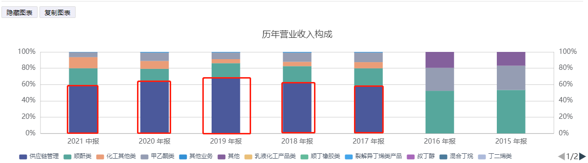 齐翔腾达的供应链业务设立多年,同样也是占据了营收的半壁江山。2017年2月,公司设立全资子公司淄博齐翔腾达供应链有限公司(下称腾达供应链)并从事供应链管理业务。2021年上半年,公司供应链管理业务实现收入103.54亿元,占公司营业收入的比例为58.33%。