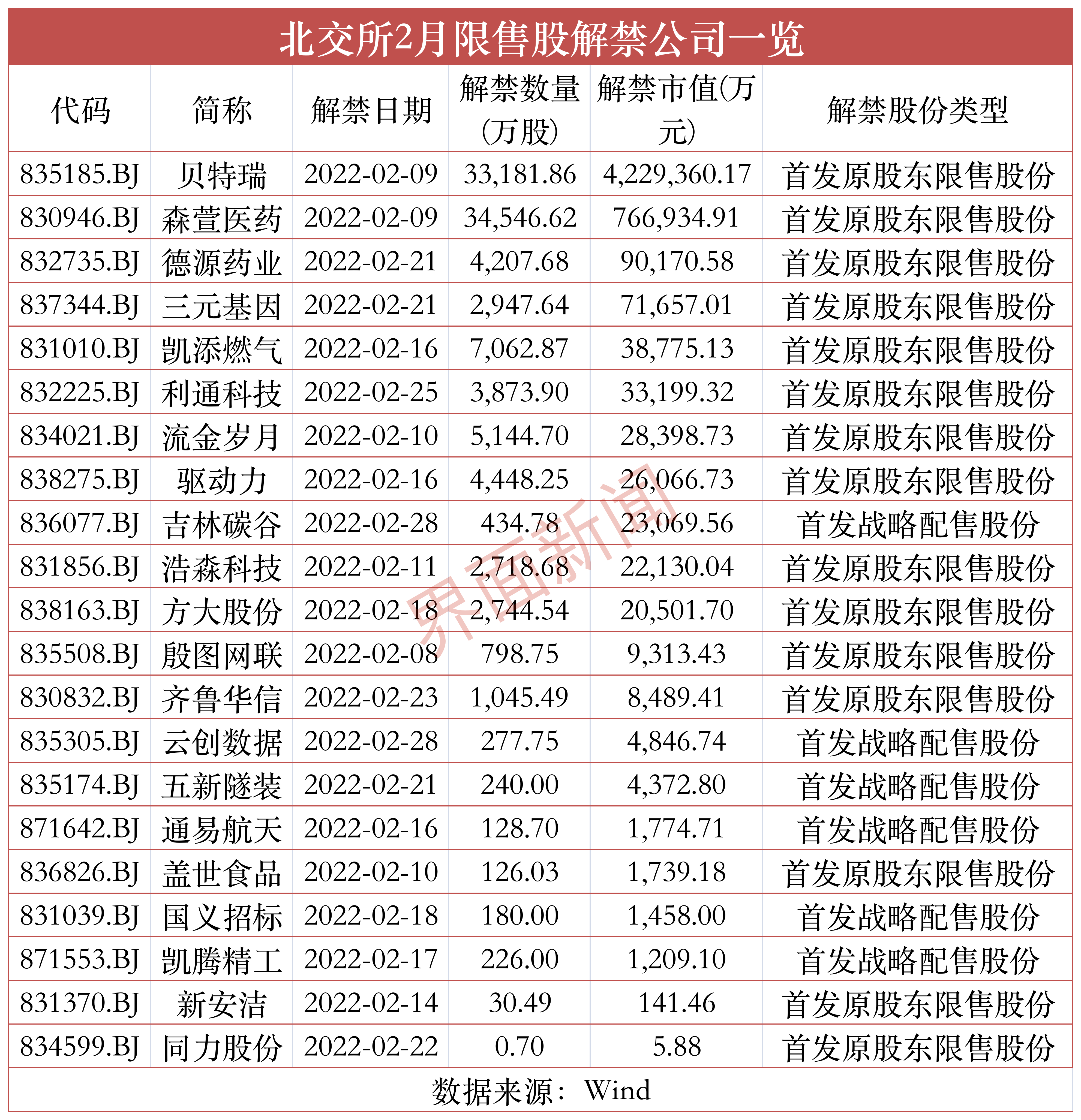 具体来看,本月共有包括北交所“市值一哥”贝特瑞(835185.BJ)在内的21家公司涉及股份解禁。以2月16日的收盘价计算,合计流通市值538亿元,其中贝特瑞解禁参考市值最高,为423亿元,占其总市值的79%,森萱医药(830946.BJ)、德源药业(832735.BJ)、三元基因(832735.BJ)的解禁市值分别为76.7亿元、9亿元和7.2亿元。