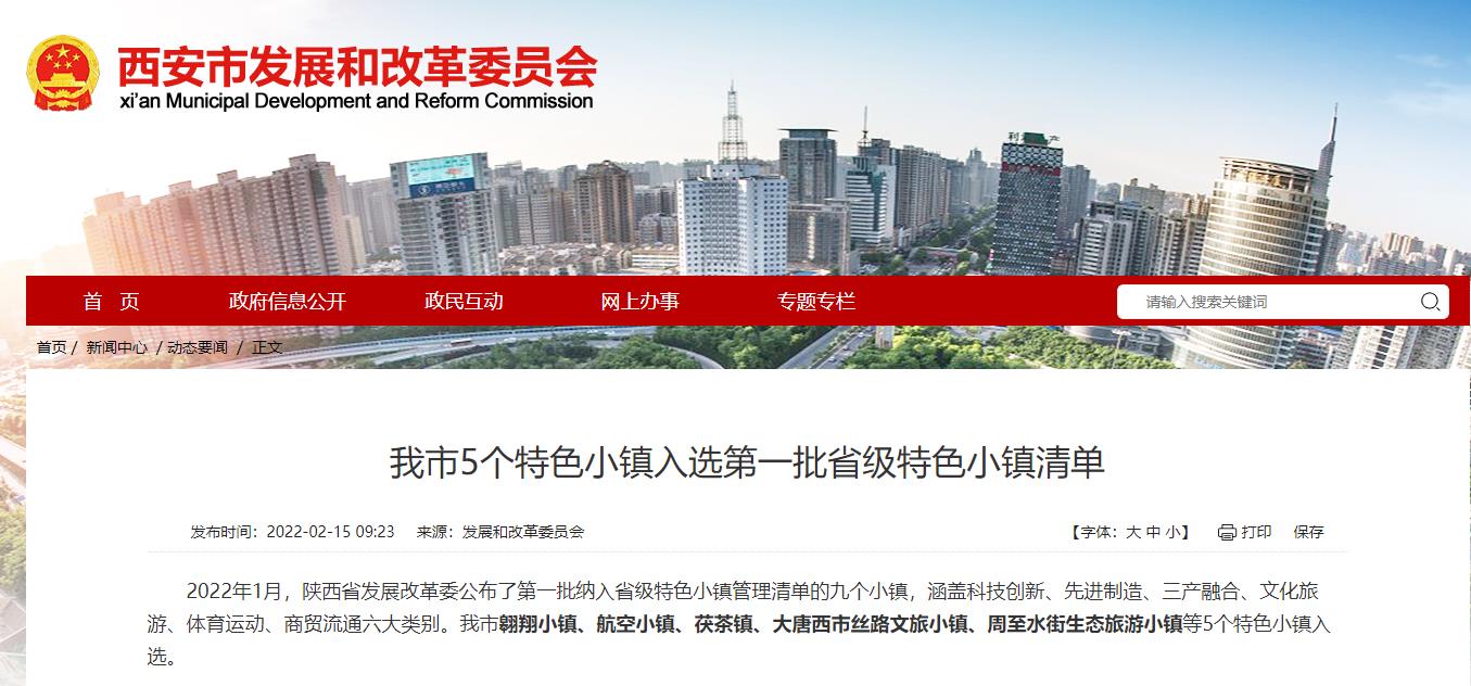 2022年1月,陕西省发展改革委公布了第一批纳入省级特色小镇管理清单的九个小镇,涵盖科技创新、先进制造、三产融合、文化旅游、体育运动、商贸流通六大类别。我市翱翔小镇、航空小镇、茯茶镇、大唐西市丝路文旅小镇、周至水街生态旅游小镇等5个特色小镇入选。