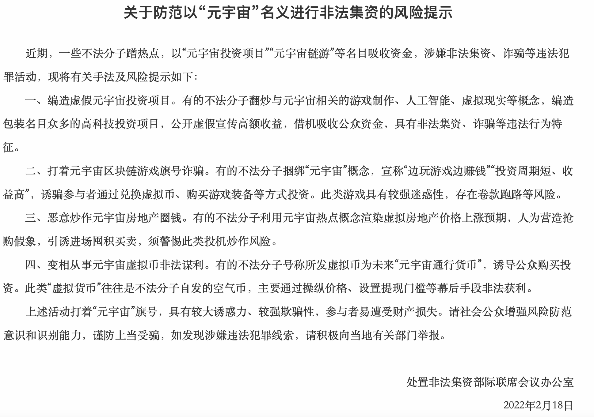 2月18日,据中国银行保险监督管理委员会官网,处置非法集资部际联席会议办公室发布《关于防范以“元宇宙”名义进行非法集资的风险提示》。