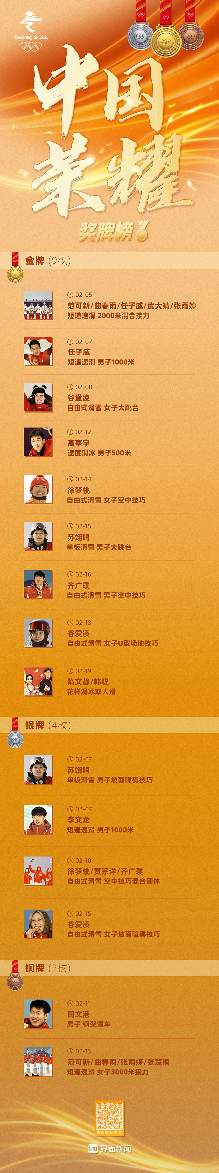 中国代表团从短道速滑2000米混合接力首金开始,到隋文静韩聪的花滑双人滑金牌结束,在单板滑雪、自由式滑雪、短道速滑、钢架雪车、花样滑冰、速度滑冰6个项目上以9枚金牌、4枚银牌、2枚铜牌的战绩圆满收官,高居奖牌榜第三,金牌数、奖牌数均创下我国参加冬奥会的历史最好成绩!