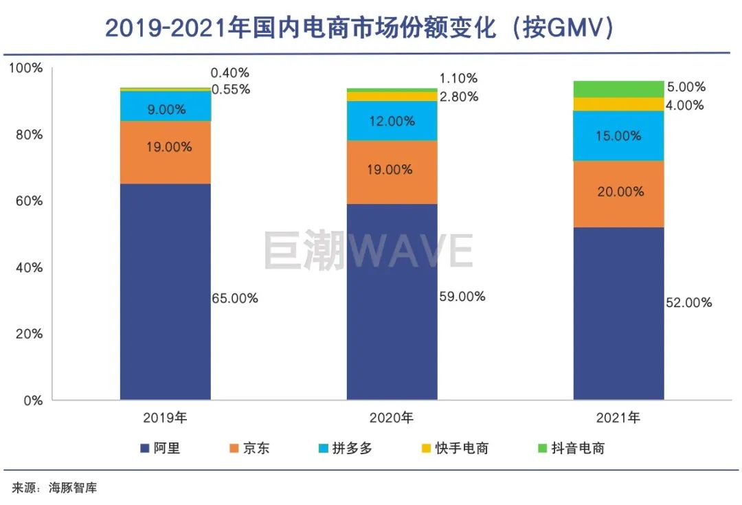 海豚社数据显示,2019年—2021年,按GMV计算,阿里的市场份额下滑了13%,而拼多多、抖音电商和快手电商则合计增加了14.1%。且截至2021年9月30日的2021Q3季度,阿里巴巴GMV同比下滑了4.8%左右,是十年来的首次。