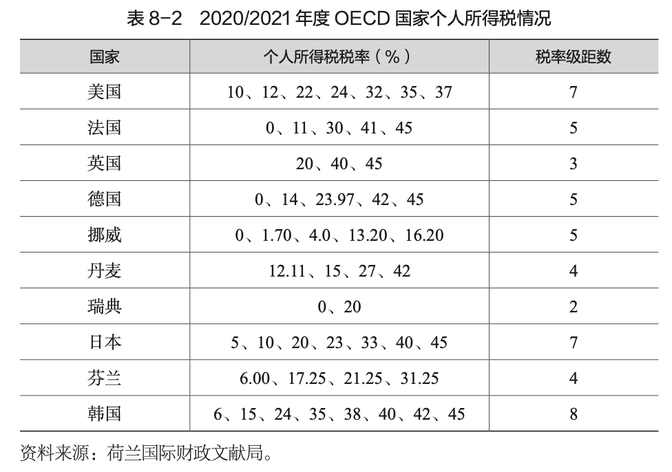 个人所得税累进功能的强弱主要与三个因素相关。一是税率级距,级距越多,累进功能越强。二是最低边际税率,这一税率越低,累进功能越强。三是最高边际税率,这一税率越高,累进功能越强。各个国家往往根据自己的实际情况,对个税进行有针对性的制度设计。以OECD国家为例(见表8-2),税率级距从2级到8级不等,如英国为3级,法国、德国为5级,美国、日本为7级。从起始边际税率来看,法国、德国、挪威、瑞典等国家的起始边际税率为0,日本为5%,韩国为6%,芬兰为6.00%,美国为10%,丹麦为12.11%,英国为20%。从最高边际税率来看,法国、英国、德国、日本、韩国为45%,丹麦为42%,美国为37%,芬兰为31.25%,挪威、瑞典的最高边际税率均低于 30%。