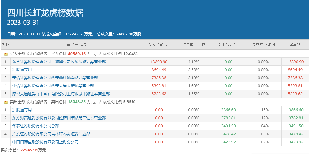 盘后披露的龙虎榜数据显示,知名游资小鳄鱼的常用席位东方证券上海浦东新区源深路高居四川长虹买方榜首,买入金额为1.39亿元。另有知名游资席位安信证券西安曲江池南路以及方新侠的常用席位中信证券西安朱雀大街分列该股买方第三和第四位,买入金额分别为7386.38万元和5393.81万元。