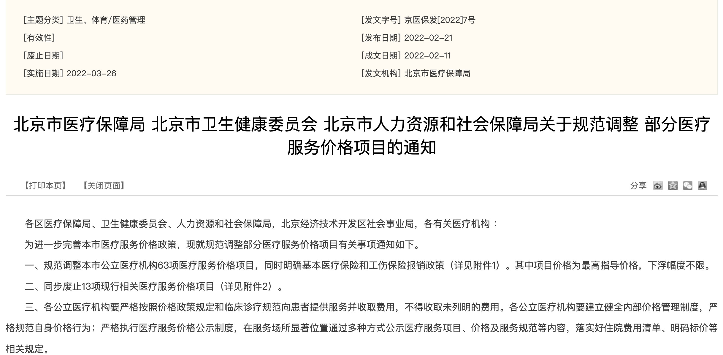2月21日,北京市医疗保障局官网发布《北京市医疗保障局 北京市卫生健康委员会 北京市人力资源和社会保障局关于规范调整部分医疗服务价格项目的通知》(以下简称为《通知》),对63项医疗服务价格项目进行规范调整。