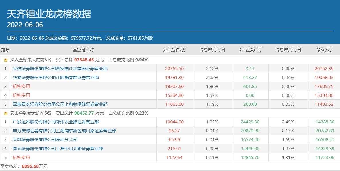 无独有偶,6月6日天齐锂业也成功吸引到了机构资金大举买入,两个机构专用席位分列该股买方第三和第四位,买入金额分别为1.82亿元和1.54亿元。