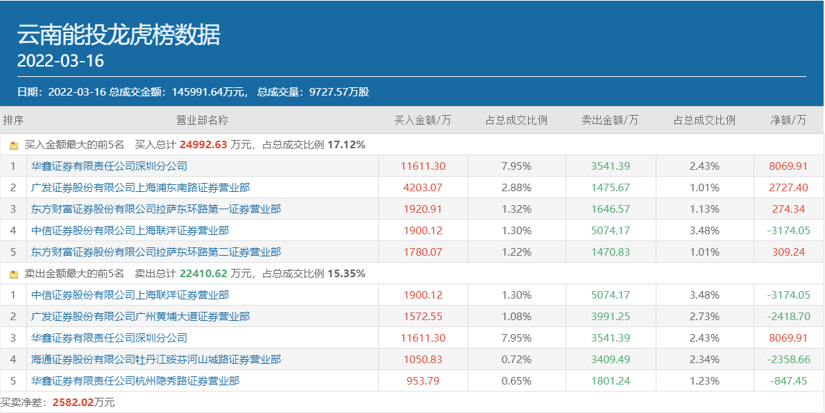 值得注意的是,这已经是湖州劳动路连续第4个交易日出现在云南能投的龙虎榜单上。此前,华鑫证券深圳分公司于3月11日买入云南能投3319.6万元,3月14日继续加仓6330.11万元,随后在3月15日买入3173.09万元,同时卖出9445.78万元。