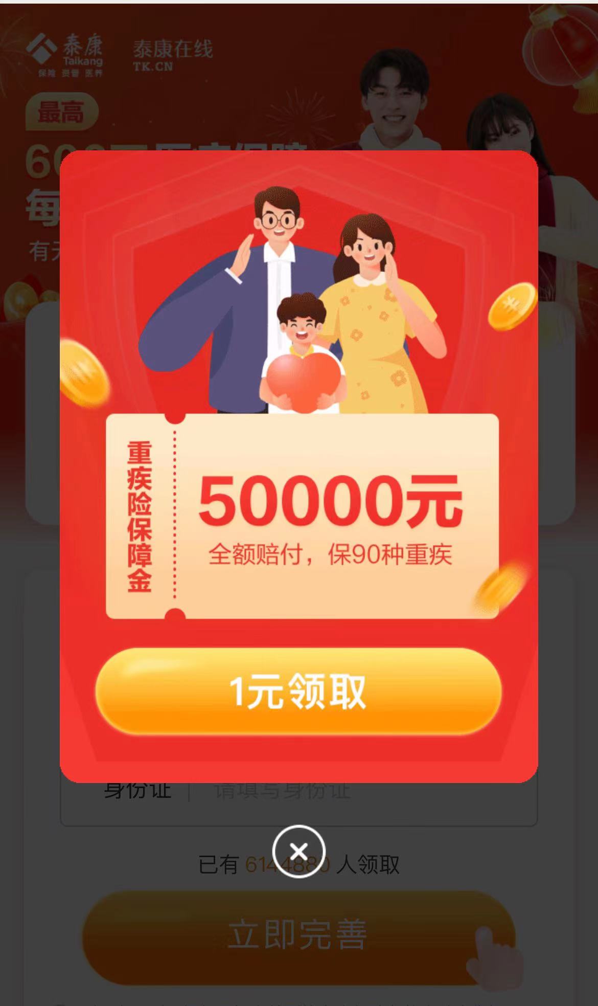 近日,界面新闻记者收到一则来自泰康在线的短信,提示要在24小时内查看。记者通过短信内链接进入页面后发现是泰康在线的百万医疗险-泰康全民保2022。该医疗险宣传“600万医疗保障,每月保费低至1元”。在“完善信息”栏输入姓名和身份证号码便可开始投保,每月保费为2.1元,默认开通自动续费。
