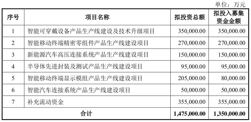 立讯精密表示,此次募集资金将用于6大产品生产线建设和补充流动资金。拟投入产品项目分别为智能可穿戴设备、智能移动终端精密零组件、新能源汽车高压连接系统、半导体先进封装及测试、智能移动终端显示模组、智能汽车连接系统等,合计拟投入募集资金99.5亿元。此外,35.5亿元将用于补充流动资金。