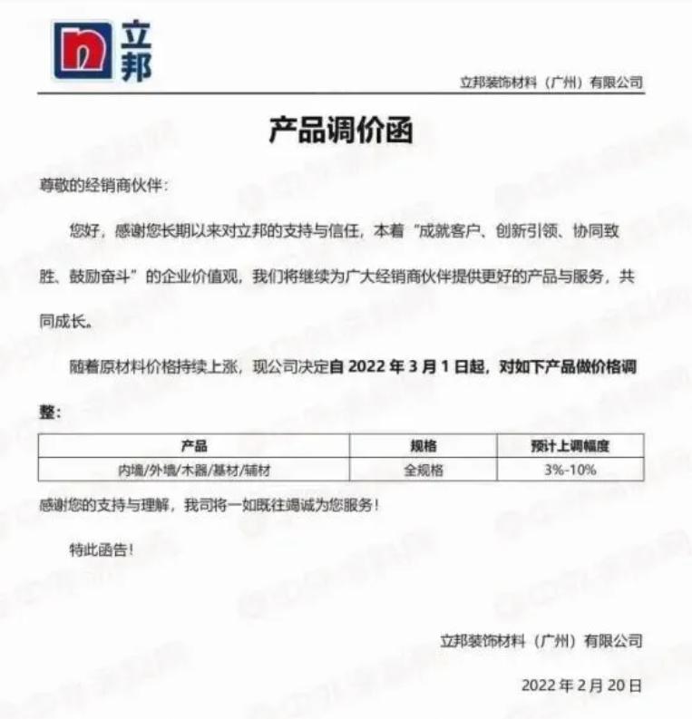 立邦广州称,随着原材料价格持续上涨,公司决定自2022年3月1日起,对公司内墙、外墙、木器、基材等产品进行全规格涨价。