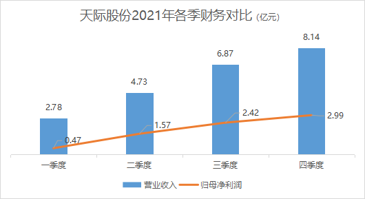 在去年的四个季度中,天际股份的业绩也呈阶梯状上升。各季归母净利润数据分别为0.47亿元、1.57亿元、2.42亿元和2.99亿元。