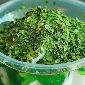 密集的香菜碎叶覆盖在香草冰淇淋顶端,加上绿色的青柠酱,整个颜色看起来就一绿到底。不过与你想象中的不同,它没有用新鲜香菜叶,而是类似于方便面调料中的脱水蔬菜,微辣加上青柠酱的混合酸甜口感,实际上香菜的味道并没有过分浓郁。