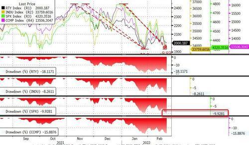 行情数据显示,在投资者消化俄罗斯向乌克兰东部顿巴斯地区派兵的影响之际,经历了一个长周末休整的美国三大股指周二收盘普遍下跌逾1%。其中,标普500指数下跌44.11点,收于4304.76点,比1月3日的高点下跌10%以上,这是该指数自2020年2月新冠疫情爆发以来首次跌入技术面回调区域。
