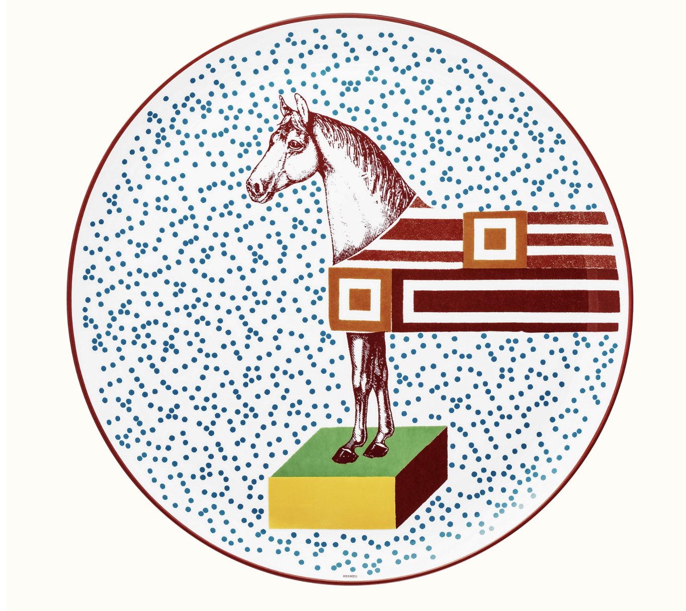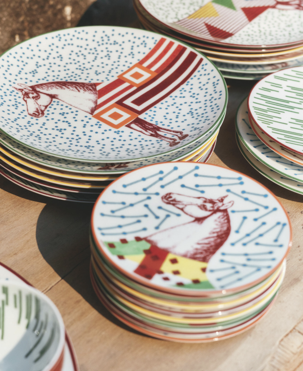 “Hippomobile”系列旨在为精致、快乐又休闲的午茶时光开发一套茶具组,而艺术家Gianpaolo Pagni尤其擅长的斑斓的色彩、图样和搞怪精神与此十分契合。餐具上看似天马行空的童趣设计是从品牌历史、马术服装常用的丝绸和卡通世界中汲取而来。工匠们花费大量时间与心力,将Gianpaolo Pagni结合形状、色块和过往版画的设计以印花方式转移到瓷器上。