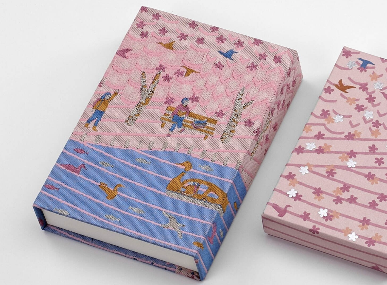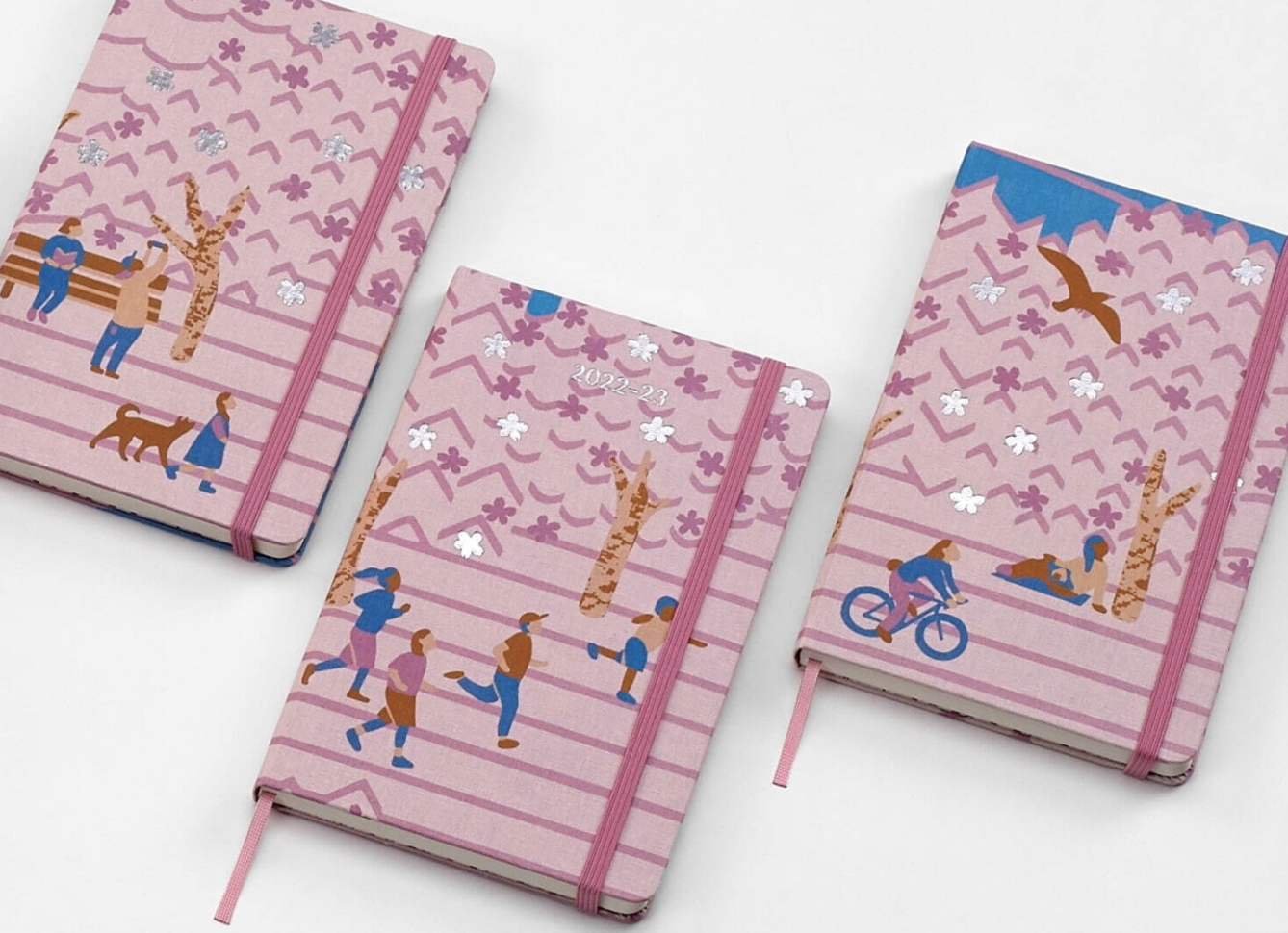 该系列笔记本在封面设计上独具巧思,灵感来源自日本上野公园——那里是东京著名的赏樱花胜地。设计师Yuri Himuro每天都会和她的狗狗在公园散步。通过细腻观察在樱花树下野餐的人,骑自行车的人,跑步的人,坐在板凳上看书的人,并记录樱花树下人们的日常活动,将上野公园的各种景观尽数捕捉。如果将该系列的笔记本依次并排放置,可将公园的全景尽收眼底。