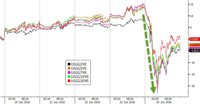 许多市场人士预期,英国脱欧胜利将进一步推迟美联储加息,美债价格攀升,10年期美债收益率大跌17基点至1.57%。对政策较为敏感的两年期美债收益率则大跌13个基点,至0.65%。