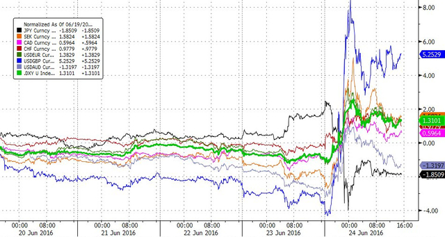 随着英国公投退欧派的胜利,全球市场避险情绪的风暴席卷而来。道指收盘暴跌逾600点,标普回吐2016年全部涨幅,欧股收跌近7%,创2008年以来最大单日跌幅。期金结束五连阴,创2014年7月以来最高收盘位。