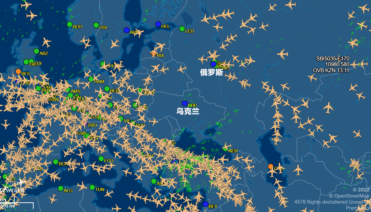 乌克兰目前已经关闭全境领空,空中交通中断。Flightaware实时数据显示,去往欧洲的飞机已经绕道,乌克兰上空已经没有飞机,俄罗斯上空的飞机也比较少。