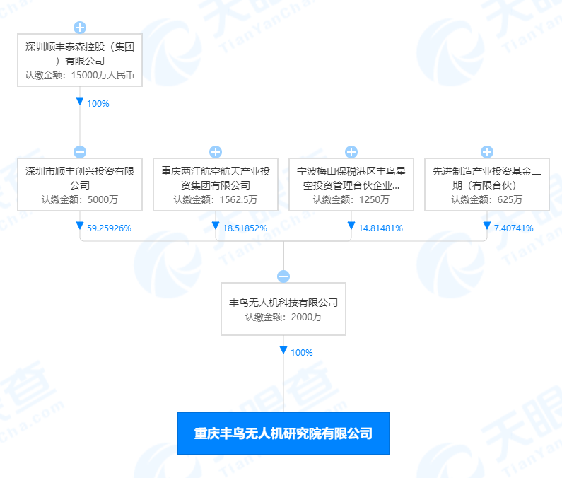 股权穿透显示,该公司由丰鸟无人机科技有限公司100%控股。据顺丰无人机官网,丰鸟无人机科技有限公司(即顺丰无人机)是顺丰集团旗下大型无人机技术和服务提供商,致力于以智能航空技术,为行业提供更高效物流服务。