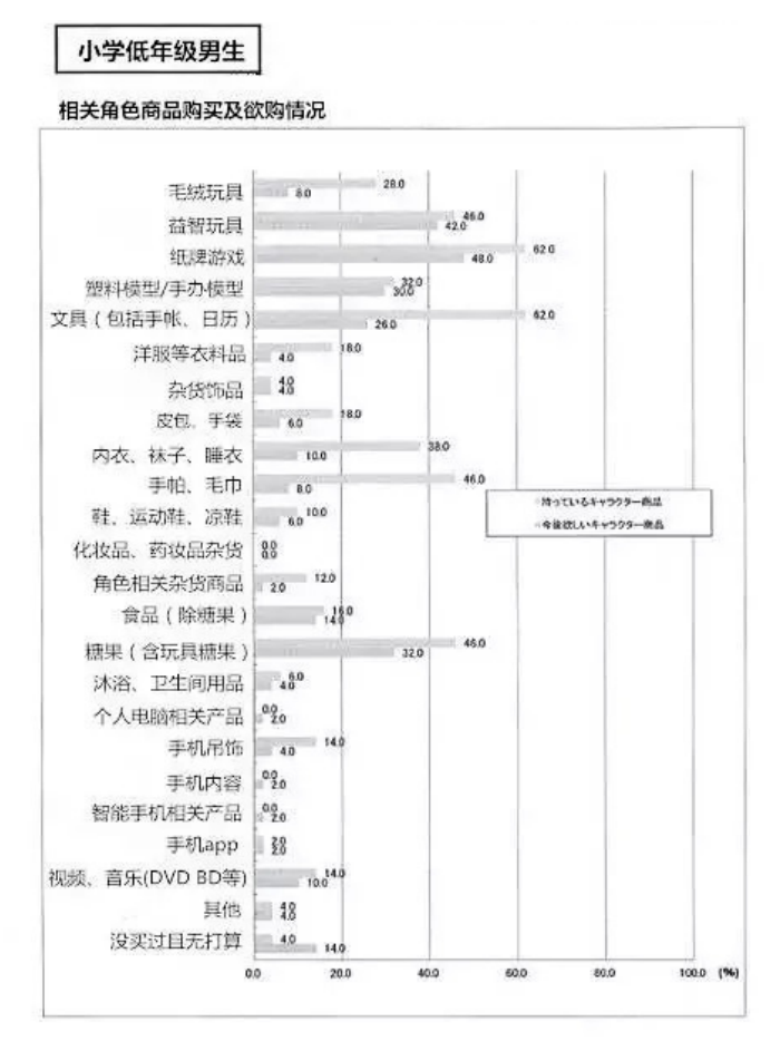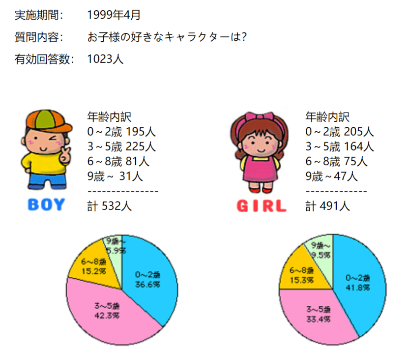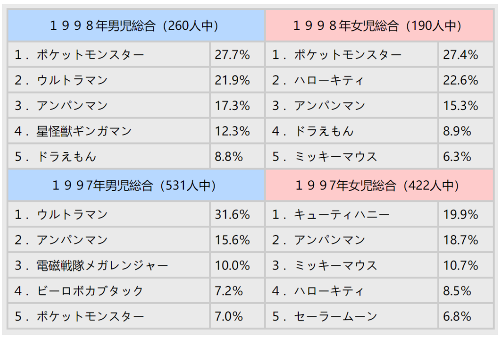 该调查覆盖0-2岁、3-5岁、6-8岁和9岁以上的男童女童。调查结果表明,1997年,日本男童最喜欢的五个IP从高到低为奥特曼、面包超人、电磁战队百万连者、铁甲小宝、口袋妖怪,女童最喜欢的为甜心战士、面包超人、米老鼠、凯蒂猫、美少女战士。