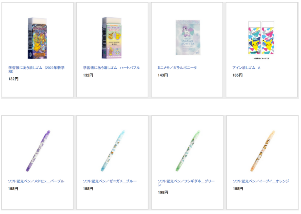 在文具方面,pokemoncenter-online能够检索到2431个商品,便宜的有一两百日元的贴纸、橡皮、荧光笔和笔记本,贵的也有一两千日元的笔盒笔袋。