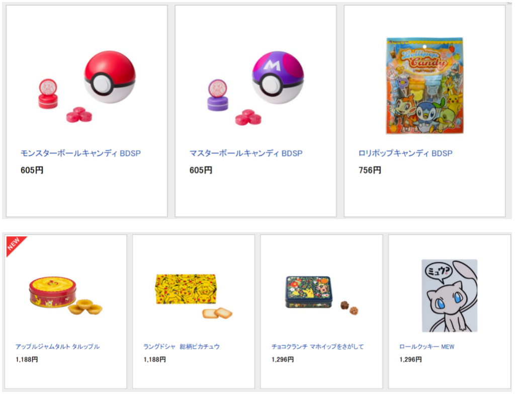 在食品饮料方面,pokemoncenter-online能够检索到220个商品,价格集中在两三百到一千多日元左右,包括糖果、饼干、巧克力等。