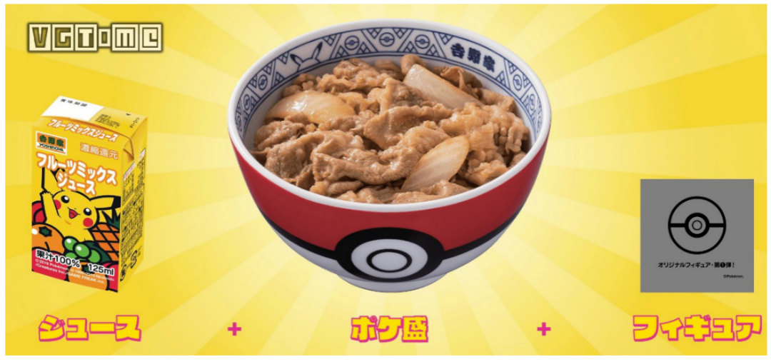 这些小零食之外,宝可梦也会和连锁餐饮品牌合作推出附加主题小玩具的主题餐饮菜品。例如,2019年日本吉野家餐厅宣布将与宝可梦公司合作,于12月19日起在全国各连锁店内开展宝可梦联动活动,追加五款特制牛丼饭和咖喱套餐,点单即可获得宝可梦主题小玩具。