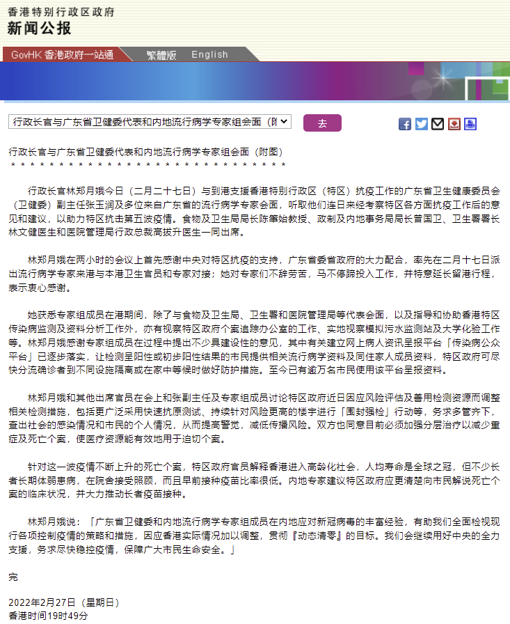据香港特区政府网消息,香港特区行政长官林郑月娥27日与到港支援香港特别行政区抗疫工作的广东省卫生健康委员会副主任张玉润及多位来自广东省的流行病学专家会面,听取他们连日来经考察特区各方面抗疫工作后的意见和建议,以助力特区抗击第五波疫情。