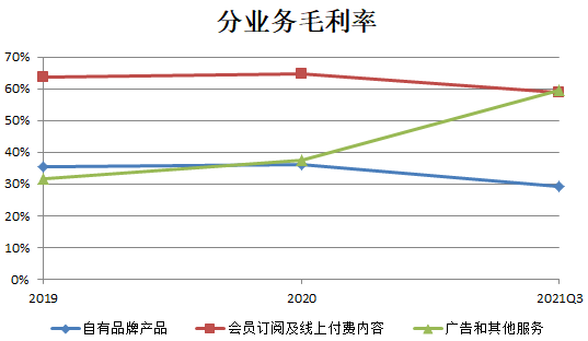 另一方面,服务的毛利率高于产品。2021年前三季度Keep会员订阅及线上付费内容和自有品牌产品的毛利率分别为58.8%和29.3%。据此计算,2021年前三季度自有品牌产品、会员订阅及线上付费内容和广告贡献的毛利分别为1.87亿元、2.23亿元和8330万元,会员订阅及线上付费内容业务的重要性可见一斑。