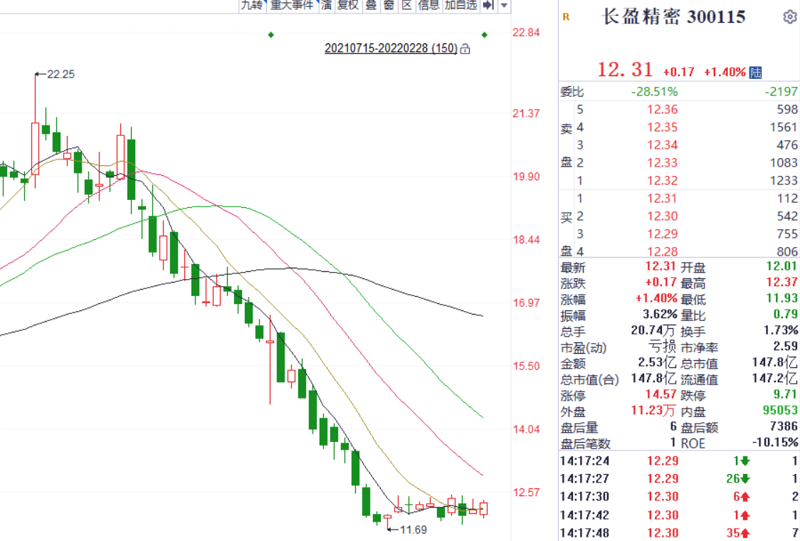 业绩暴雷后,长盈精密股价持续下行,自2021年12月22日高点至今,已跌去45%。