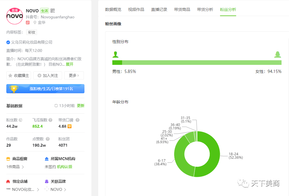 他们的价格往往比原品牌低出十倍不止,而去购买如此低价的产品的消费人群,往往都是对美妆产品认知过少或经济条件较差人群。医美查数据显示,novo品牌的绝大部分粉丝年龄层在6到24岁。这个年龄段的群体,大部分还未踏入社会,对品牌的认知度不高、可支配的零花钱也不多,但却有化妆需求,才在一知半解之下,选择购买了该品牌的产品。