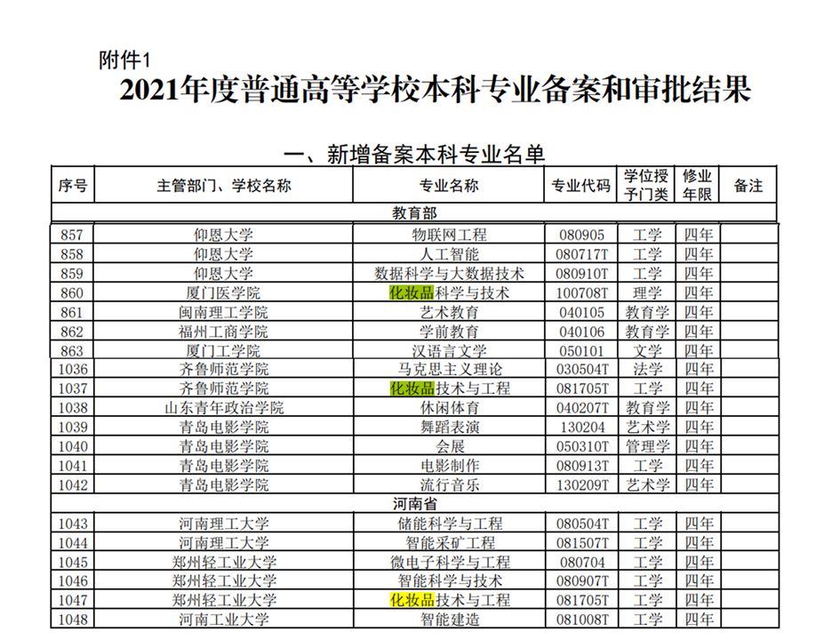 此后,普通高等学校本科专业新增设化妆品专业的“闸口”打开。青眼梳理显示,2019年3月25日,国家教育部发布2018年度新增备案本科专业名单显示,广东药科大学、肇庆学院、厦门医学院3所高校,分别新增设了“化妆品科学与技术”和“化妆品技术与工程”;2020年,又有5所高校新增这两大化妆品专业;2021年,则是有7所高校增加化妆品专业。