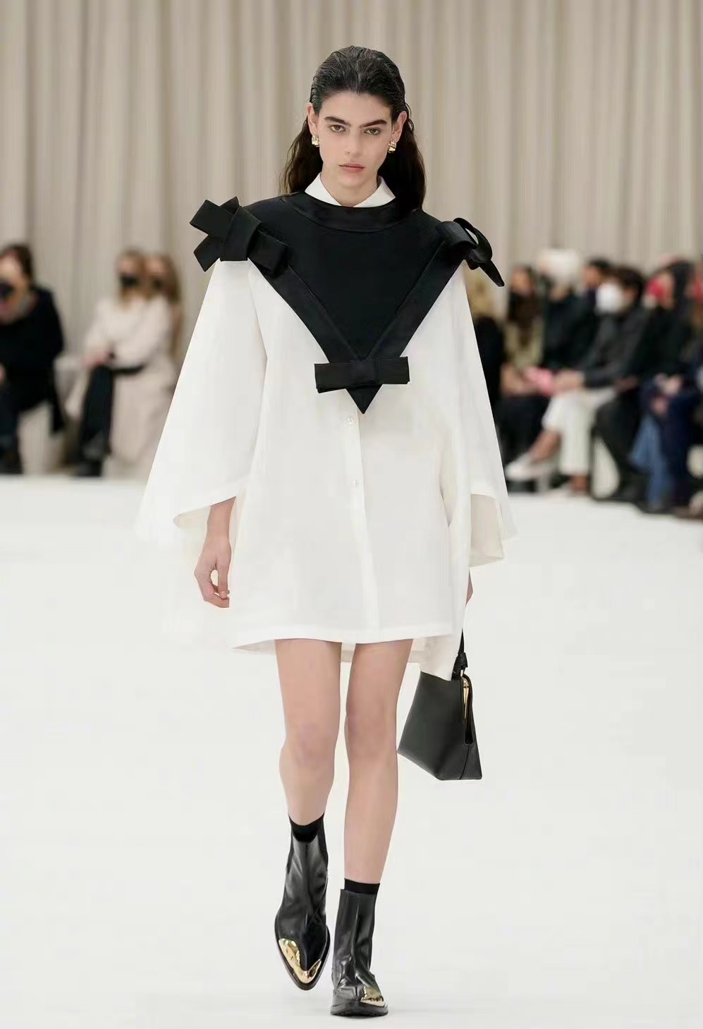 系列连衣裙既有长款的喇叭形,又有短款的几何形,下摆饰有荷叶边。长裤宽松且率性。手工制作的全亮片和双面针织面料极具奢华感,有些则融合了运动服饰的优点。宽大的安卡拉毛衣流畅飘逸。其中,一件连衣裙和毛衣通过手工编织四种不同的丝绸和羊毛纱线,塑造出了一个交织的云彩形象;充满雕塑感的短斗篷和独具性别特点的托斯卡纳羊毛大衣,饰有宽大的花领和大蝴蝶结,以及对比鲜明且排列各异的纽扣线条;真丝针织衫上的星座手绘用独特的方式,诉说着该系列的主题初衷;白色、橘色或黑色的连衣裙采用凸纹花边工艺,展现出3D镂空效果;针织蝴蝶结包拥有几何状的外观和柔软的触感,刻画出了该系列自然的菱形纹理。