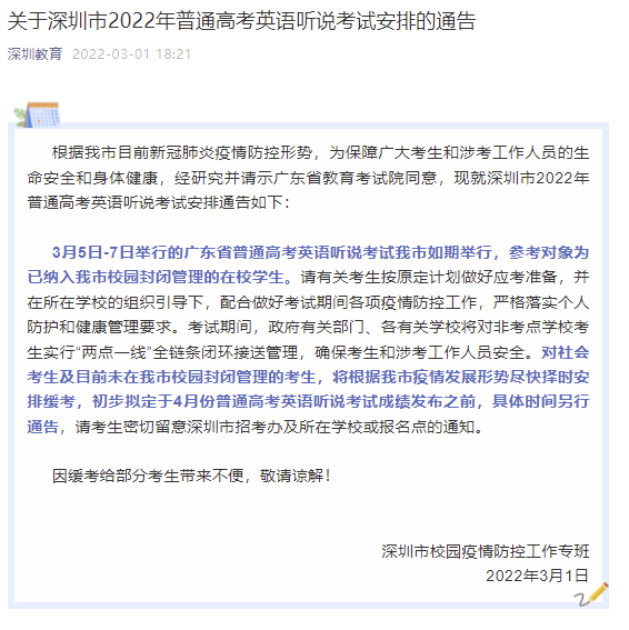 “深圳教育”微信公众号3月1日消息,深圳市校园疫情防控工作专班发布《关于深圳市2022年普通高考英语听说考试安排的通告》,具体内容如下。